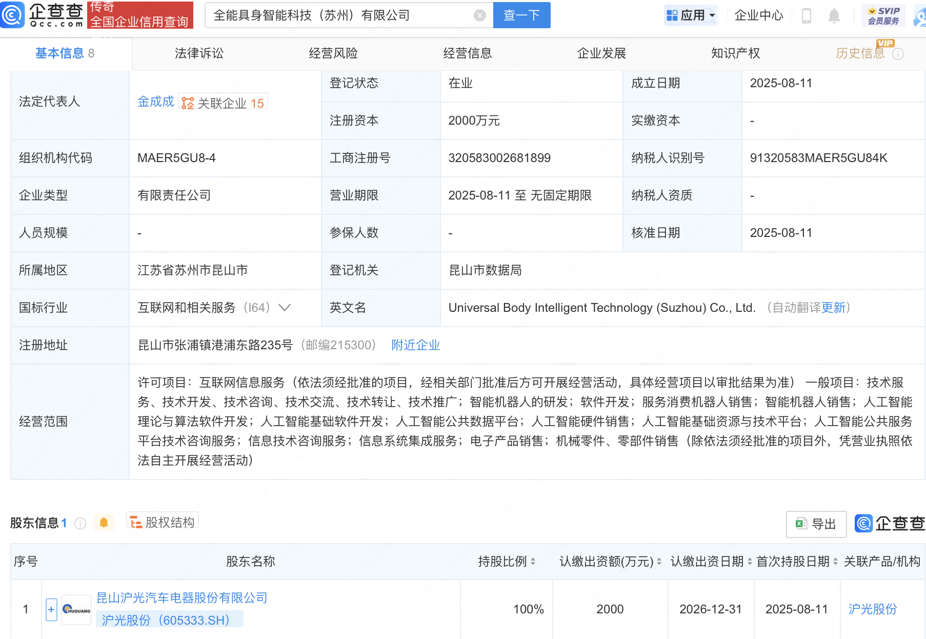 近日,全能具身智能科技(苏州)有限公司成立,注册资本2000万元,经营范围包含:智能机器人的研发;人工智能理论与算法软件开发;人工智能基础软件开发;人工智能公共数据平台等。企查查股权穿透显示,该公司由沪光股份(605333)全资持股。