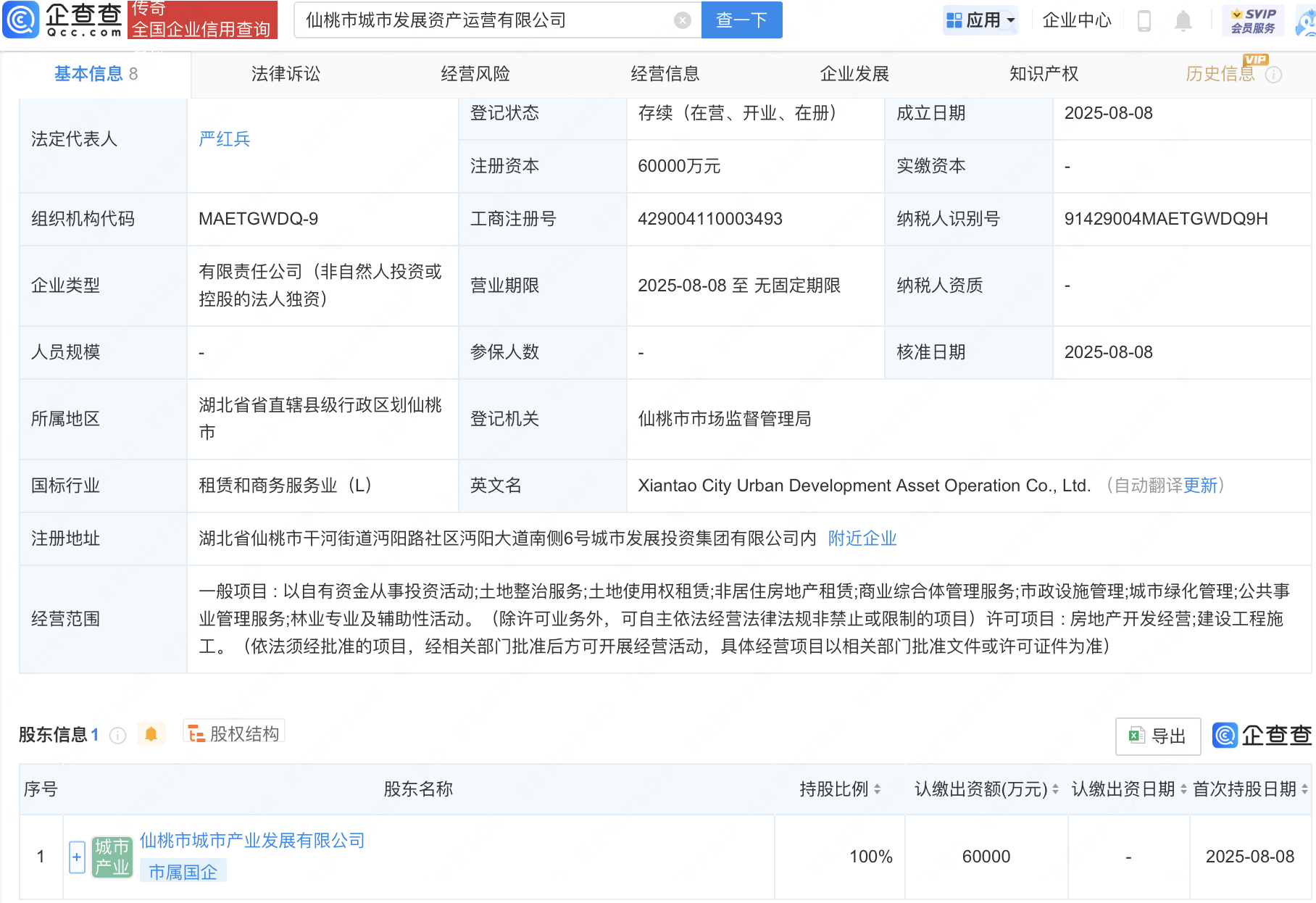 近日,仙桃市城市发展资产运营有限公司成立,注册资本6亿元,经营范围包含:以自有资金从事投资活动;土地整治服务;土地使用权租赁;非居住房地产租赁等。企查查股权穿透显示,该公司由仙桃市城市产业发展有限公司全资持股。
