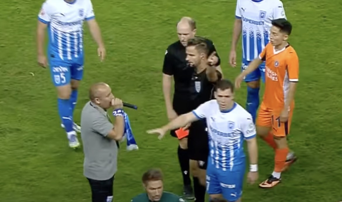 在一场欧协联资格赛中,克拉约瓦大学的播音员被出示红牌。